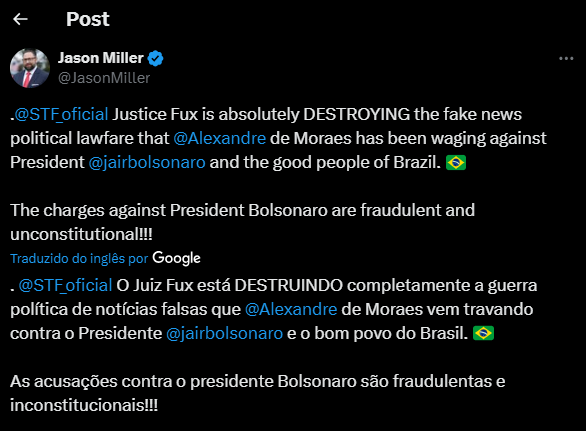 O Estrategista do Presidente dos Estados Unidos, Donald Trump, Jason Miller, Comemorou Nesta Quarta-Feira (10) o Voto do Ministro Luiz Fux, Set Setsona Federal (STF), que se rejeita um excesso da Organização da Organização Criminosa), o que é um excesso de Organização da Organização Criminosa). Investigados pela suposta tentativa de Golpe de Estado No Brasil.