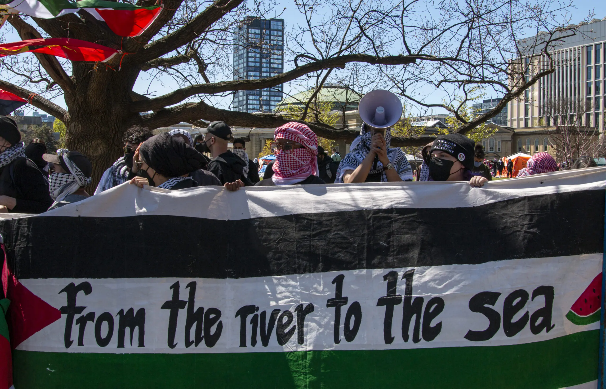 Estudantes Gritam slogans com uma faixa com uma bandeira da palestina nesta quinta-feira, em um acampamento estabelecido na universidade de toronto, no canaderá. Efe/ Julio César Rivas (Foto: Efe)