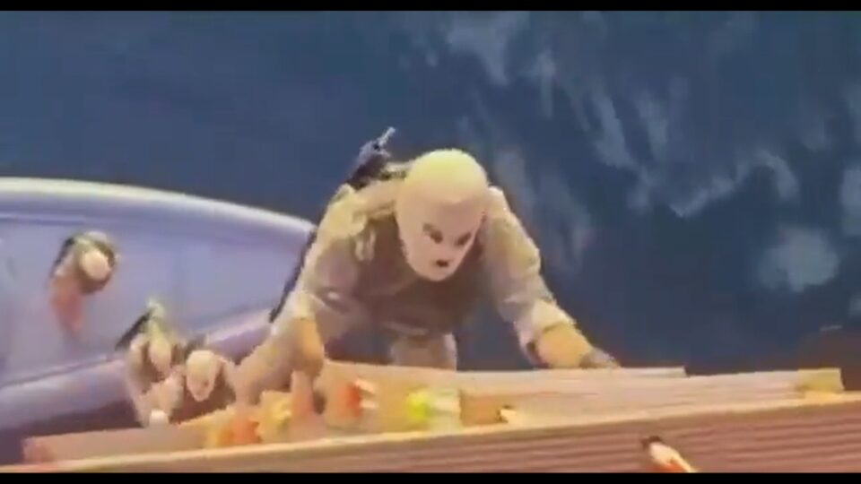 Em um dos vídeos, os soldados mascarados abordaram um navio porta-contêineres com a inscrição MSC na lateral, sobem uma escada e embarcaram no cargueiro.