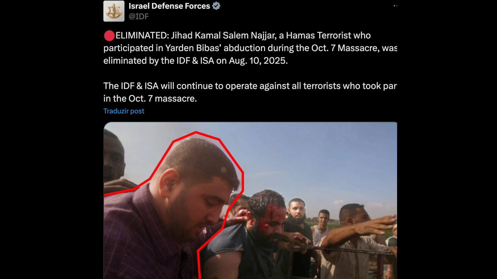 “Uma Pequena parte do FECHENTO ACONTECEU HOJE. Obrigado às fdi, Ao Shin Bet ea Todos que participam da eliminação de um dos terroristas que me sequestraram em 7 Destubro.
