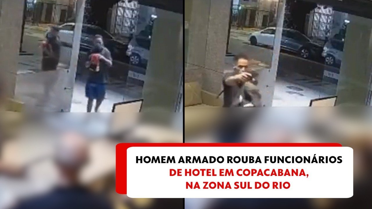 Uma Câmera de Segurança flagraou um assalto na recepção de um hotel na rua 5 de julho, em copacabana, zona sul do rio, na múite desta quinta-feira (22). Ó ladrão, que estava com uma mochila e Armado, se atrapalhou e derrubou um logotipo máscoa Após anuncia o roubo.