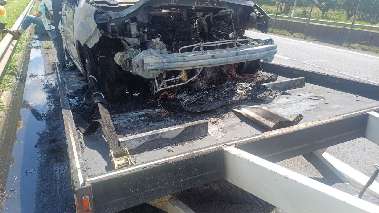 Carro em painel pega fogo após ser removido na Via Dutra, em Resende