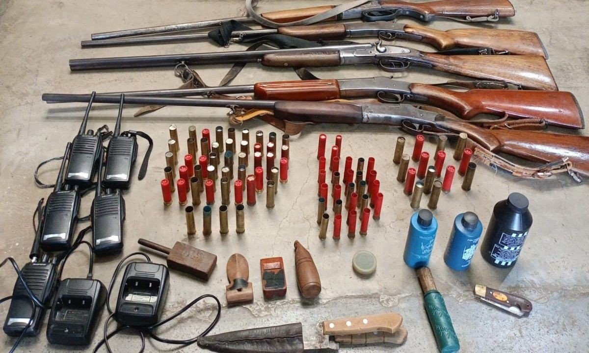 Os militares apreenderam duas espingardas calibre 28, uma espingarda cano duplo calibre 32 e outras duas de calibre 32. Também foram encontradas munições variadas, apitos chamariz, cinco rádios comunicadores, duas bases carregadoras, dois frascos de pólvora, uma armadilha para tatus, duas facas, um canivete, bem como outros equipamentos.