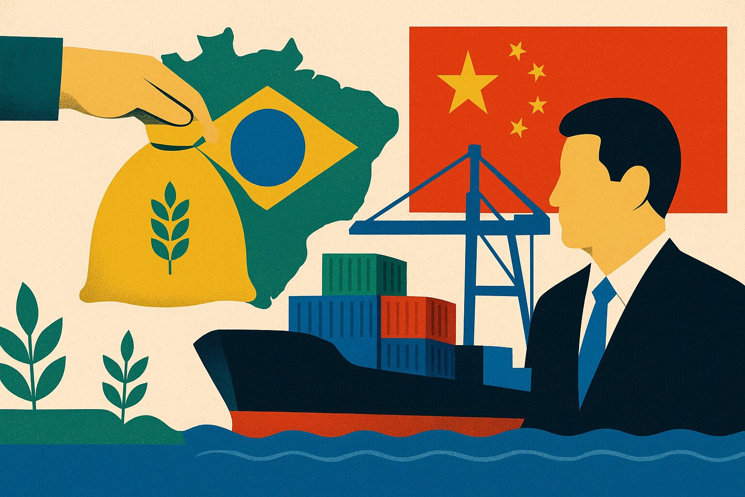 Os principais itens brasileiros embarcados para o país asiático no setor, em 2024, foram soja (US$ 31,6 bilhões), carne bovina (US$ 6 bilhões), celulose (US$ 4,6 bilhões), algodão (US$ 1,7 bilhão), açúcar (US$ 1,4 Bilhão) e Carne de Frango (US $ 1,3 Bilhão).