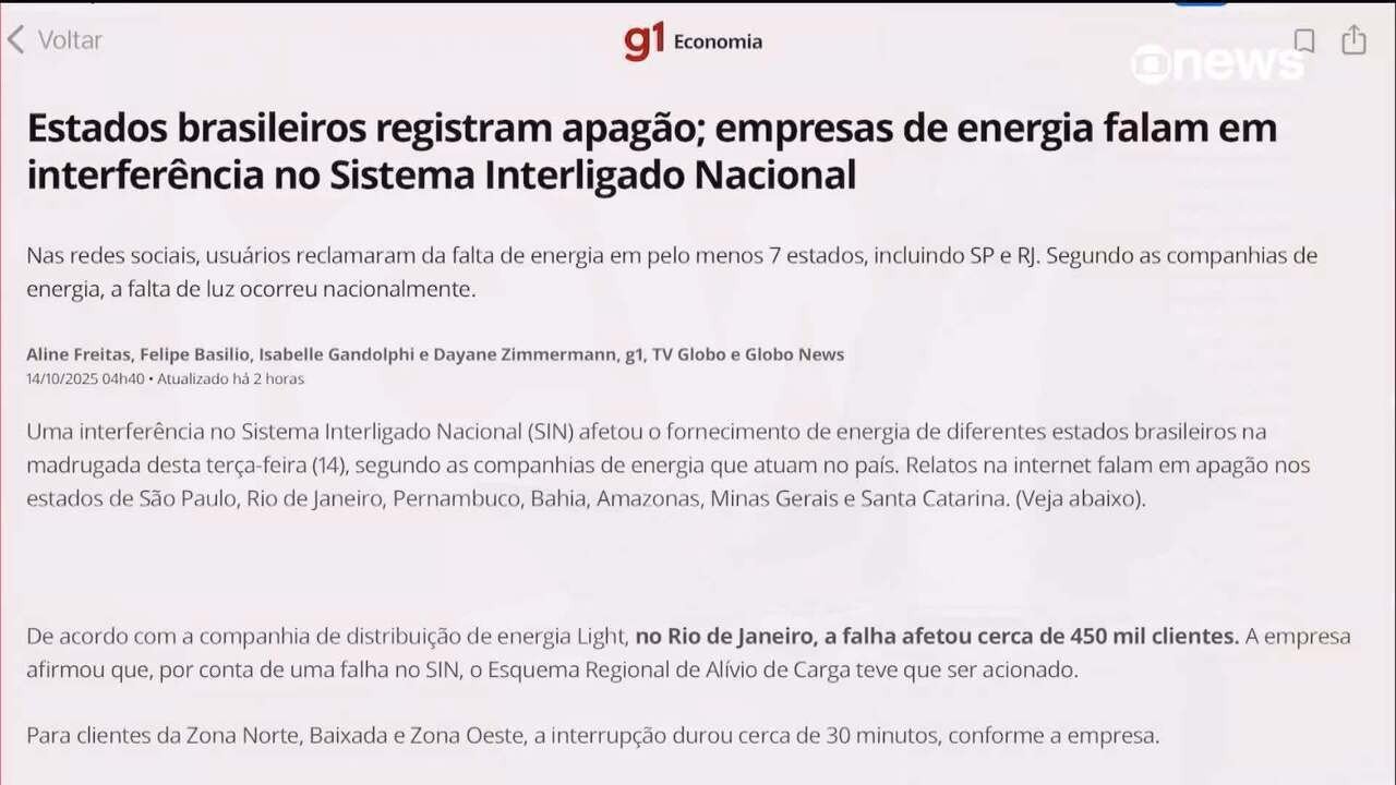 Estados brasileiros registram pagamento; Empresas de energia falam em interferência no Sistema Interligado Nacional