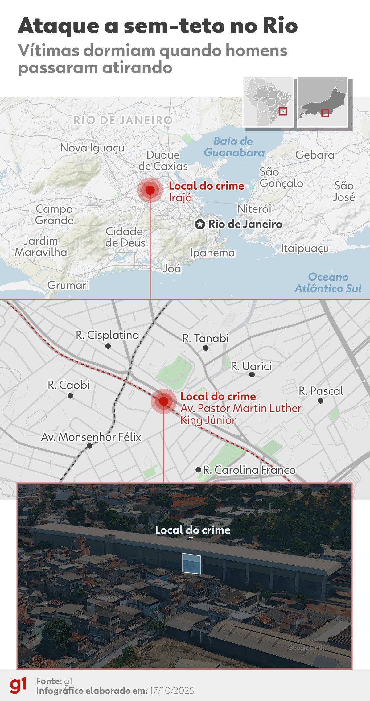 Homem em situação de rua sobreviveu a um ataque, mas está grave Três atiradores receberam um fuzil e duas pistolas de calibres diferentes em um ataque nas imediações do metrô de Irajá, na Zona Norte do Rio, na madrugada desta sexta-feira (17). Dois homens em situação de rua morreram no local, e um terceiro, de 38 anos, que tentou fugir, foi baleado e levado para o hospital em estado grave. A Delegacia de Homicídios da Capital investiga o caso e tenta identificar os criminosos. Durante a perícia, os agentes encontraram marcas de tiros em uma casa próxima — um dos tiros atravessou a janela e atingiu uma televisão, mas ninguém ficou ferido. O ataque ocorreu por volta das 4h. Inicialmente, acreditava-se que os homens tinham sido atirados ao assassino dentro de um carro. Agora, já se sabe que os criminosos pararam o veículo perto de um retorno da Avenida Pastor Martin Luther King Júnior, desceram do carro, caminharam até onde os homens dormiram e abriram fogo com fuzis. Os disparos não foram concentrados em um único ponto — os corpos ficaram em extremidades opostas do viaduto. Ainda não há informações sobre o que teria motivado o ataque. Quem foram as vítimas Seu Etevaldo, conhecido como Bahia (E), um dos mortos em Irajá Batikum Afro/Divulgação O homem baleado tem uma anotação criminosa por associação ao tráfico. Os mortos não tinham sido identificados até a última atualização desta reportagem, mas na região eram conhecidos como Bahia e Milharina. “São 2 coroas que já moram debaixo do metrô há muito tempo. Um andava com bengala, mal conseguia andar. O outro vendia verdura. O terceiro é o Pará. Todo mundo da redondeza conhecia eles”, contornou Érico Cerqueira, morador da região. A técnica de enfermagem Camila de Jesus Gomes, que passa diariamente pelo local, lamentou o crime: “Eles não mexiam com ninguém. Davam bom dia, boa tarde. Eram tranquilos. O que leva um ser humano a fazer isso? Muito triste, lamentável.” Vítima era percussionista Homens são assassinados embaixo do metrô de Irajá Reprodução/TV Globo Antes de viver em situação de rua, Bahia, também chamado de Etevaldo, era percussionista em Salvador. No Rio, onde Vivia há muitos anos, encontrou abrigo sob o viaduto da estação de metrô de Irajá. Mesmo com as limitações de mobilidade causadas pelos AVCs, mantinha uma rotina marcada pela música e pela convivência com a comunidade. Ele participou das atividades do Batikum Afro, projeto social que promove oficinas de música afro-brasileira em comunidades da Zona Norte. “Ele cantava, participava e estava sempre com a gente. Tocávamos percussão, e ele lembrava muito de Salvador. Um dia, em 2023, apareceu do nada e começou a cantar junto. Criamos uma relação. Todo ensaio ele aparecia”, conta Luccas Xaxará, diretor do projeto. “Ele era o mais vulnerável ali. Aquele trecho nunca teve muitos moradores, só uns 6, mais ou menos. A comunidade conhecia. Tinha um barbeiro que cortava o cabelo dele, o pessoal dava alimentação. A gente oferecia café da manhã e interagia durante os ensaios”, relembra Luccas. Mesmo depois de perder parte dos movimentos, o Bahia continuou a cantar. “Chegava, começava a cantar e animava todo o mundo”, diz Luccas. Agora, o grupo busca formas de preservar sua memória. “Queremos garantir que ele não seja esquecido. Ele não tinha documentos, mas tinha história. Estamos atrás da família dele para que ele tenha um sepultamento digno”, afirma Luccas. Mapa mostra onde foi o ataque a tiros a sem-teto Infografia: Veronica Medeiros/g1 Cápsula de tiro disparado embaixo do viaduto em Irajá, no Rio Reprodução/ TV Globo
