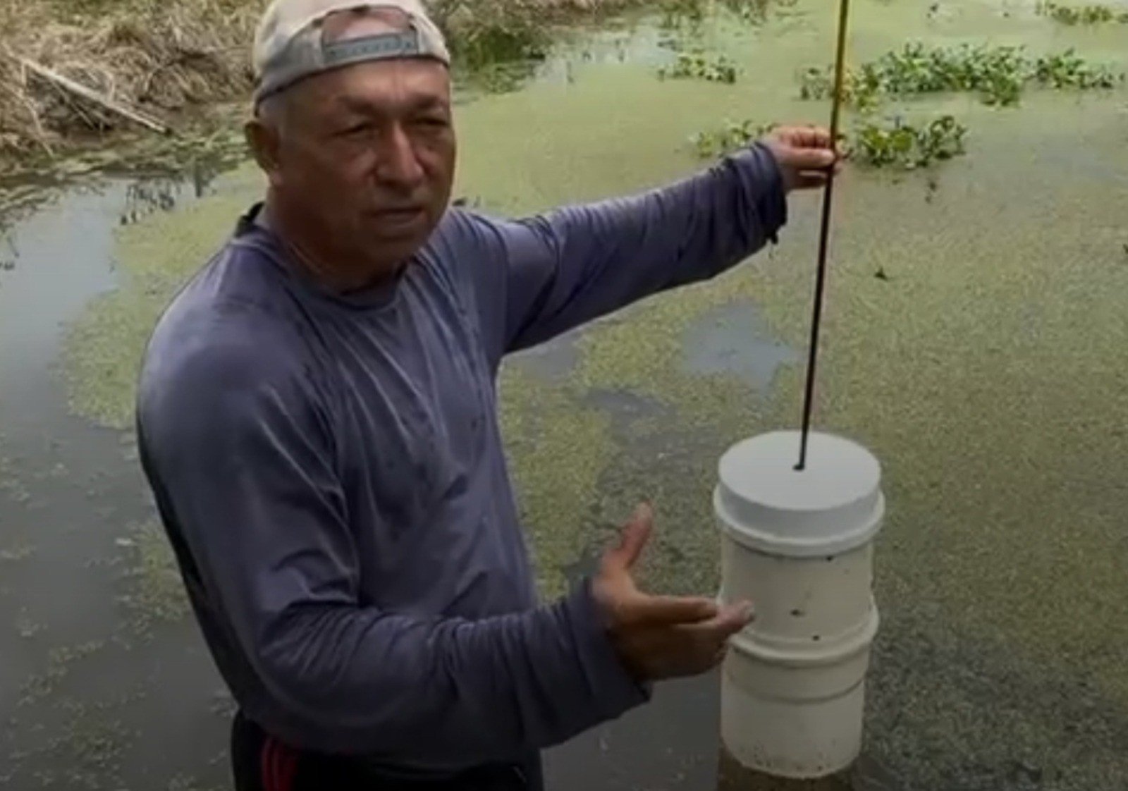 Aposentado Celso Alves de Oliveira usa pluviômetro caseiro com mecanismo hidráulico, em Bocaina, para monitorar o nível da água e repassar informações à Defesa Civil e comunidade. Hoje, ele mantém um controle sistemático das precipitações.