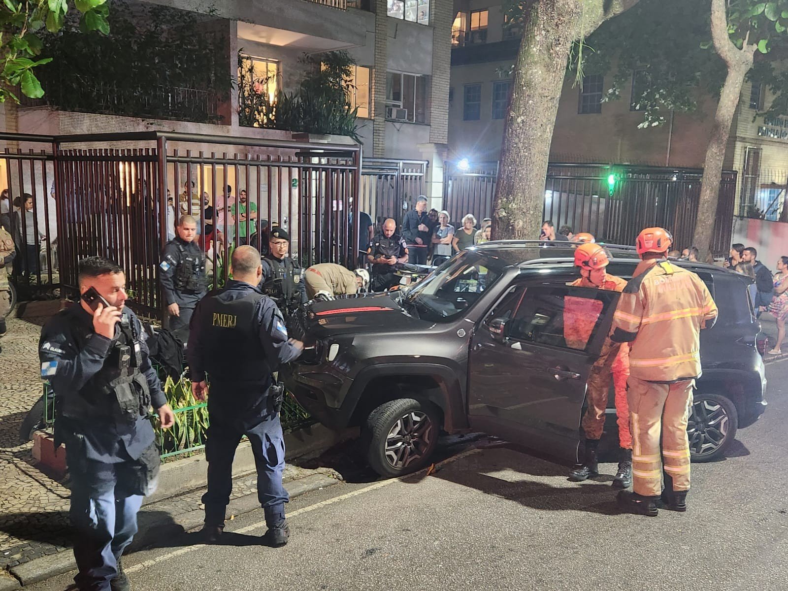 Motorista em carro blindado reage a tentativa de assalto e derrubou ladrões em moto no Jardim Botânico, na Zona Sul do Rio