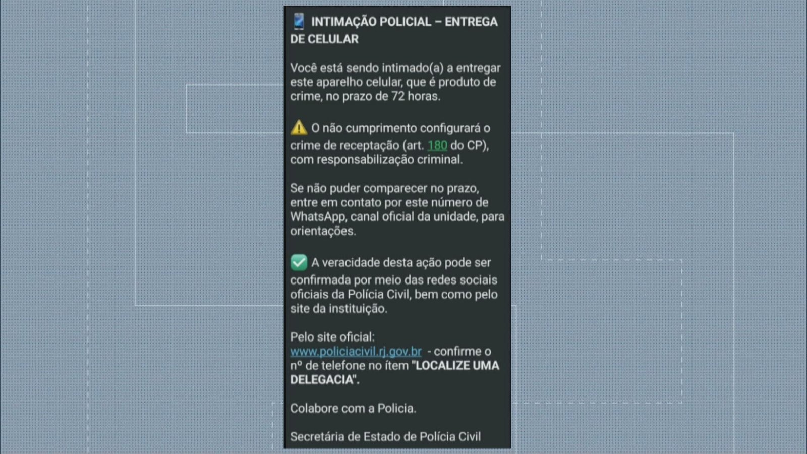 Intimação para entrega de celulares roubados Reprodução/TV Globo A Polícia Civil começou a enviar nesta segunda-feira (20) mais de 4,2 mil intimações para usuários de celulares roubados ou furtados. A ação faz parte de mais uma fase da operação Rastreio, contra o roubo, furto e recepção de celulares. Quem recebeu a mensagem deverá entregar os dispositivos na delegacia em até 72 horas. Aqueles que não fizerem podem ser responsabilizados criminalmente. “É muito importante que o cidadão que não roubou o celular de má-fé cooperado com o trabalho da polícia e entregou o aparelho, que será restituído aos legítimos proprietários. Mas quem não colaborar será alvo das ações da Polícia Civil”, declara o secretário Felipe Curi. “Esse celular que está nas suas mãos pode ter custado uma vida. Nós vamos responsabilizar todos os que fazem parte da cadeia criminosa”, pontudo. Operação Rastreio mira receptadores de celulares comprados 📱Baixe o app do g1 para ver notícias do RJ em tempo real e de graça Desde maio, quando a operação começou, 420 pessoas foram presas e 5,8 mil celulares foram apreendidos. Na convocação anterior, mil celulares foram devolvidos às delegacias. Outros 1,4 mil foram apreendidos em uma operação em junho. Veja os vídeos que estão em alta no g1