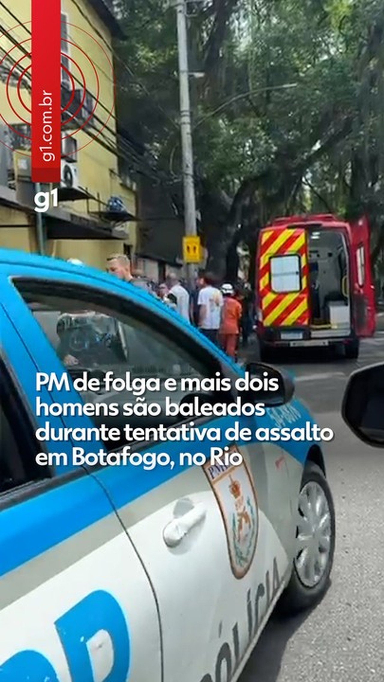 PM de folga e mais dois homens são baleados durante tentativa de assalto em Botafogo Um policial militar que estava fora de serviço e mais dois homens foram baleados durante uma tentativa de assalto na tarde desta segunda-feira (24) na Rua Visconde Silva, em Botafogo, na Zona Sul do Rio. O agente, que estava de moto, foi ferido na cabeça após sofrer uma tentativa de assalto por dois homens que estavam em outra moto. Um dos crimes também foi baleado, segundas testemunhas. A terceira vítima foi um homem que passava pelo local e foi atingido por uma bala perdida. O policial foi preso por uma viatura da própria corporação para o Hospital Municipal Miguel Couto, na Gávea. O Corpo de Bombeiros informou que equipes do quartel de Copacabana foram acionadas por volta das 13h10 para atender a ocorrência. As vítimas receberam os primeiros socorros no local. Ainda não havia informações atualizadas sobre o estado de saúde dos feridos até às 14h50. Tentativa de assalto termina com 3 baleados em Botafogo Reprodução/Redes sociais Dois homens são baleados em Botafogo Reprodução: Redes sociais Veja os vídeos que estão em alta no g1