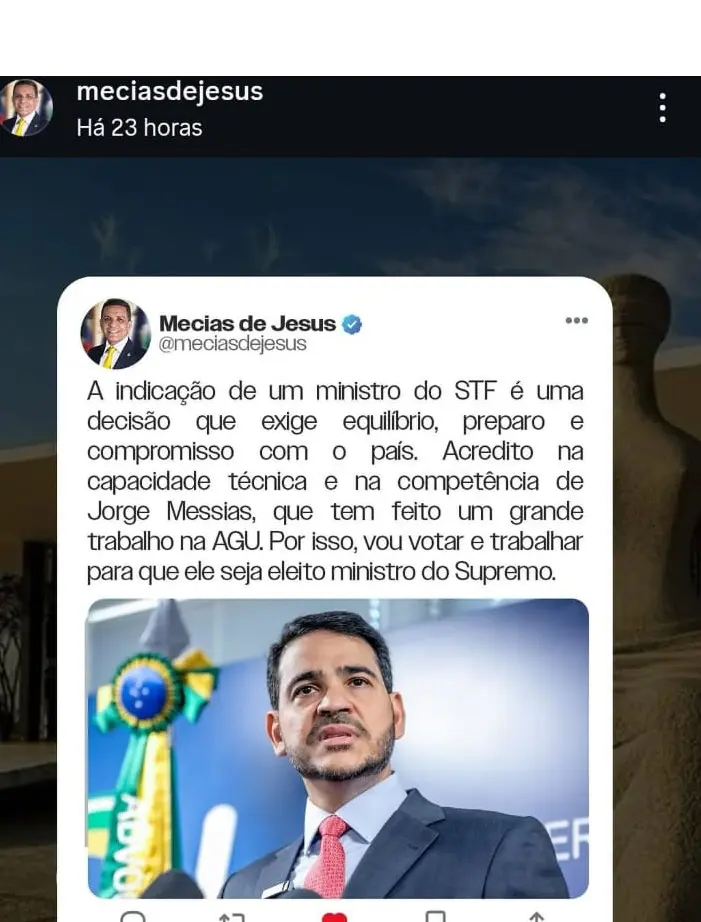 Líder dos Republicanos no Senado Federal, o senador Mecias de Jesus (RR) fez uma manifestação de apoio à indicação do advogado-geral da União (AGU), Jorge Messias, para o Supremo Tribunal Federal (STF). Messias seria o favorito do presidente Lula para ser indicado para a vaga.