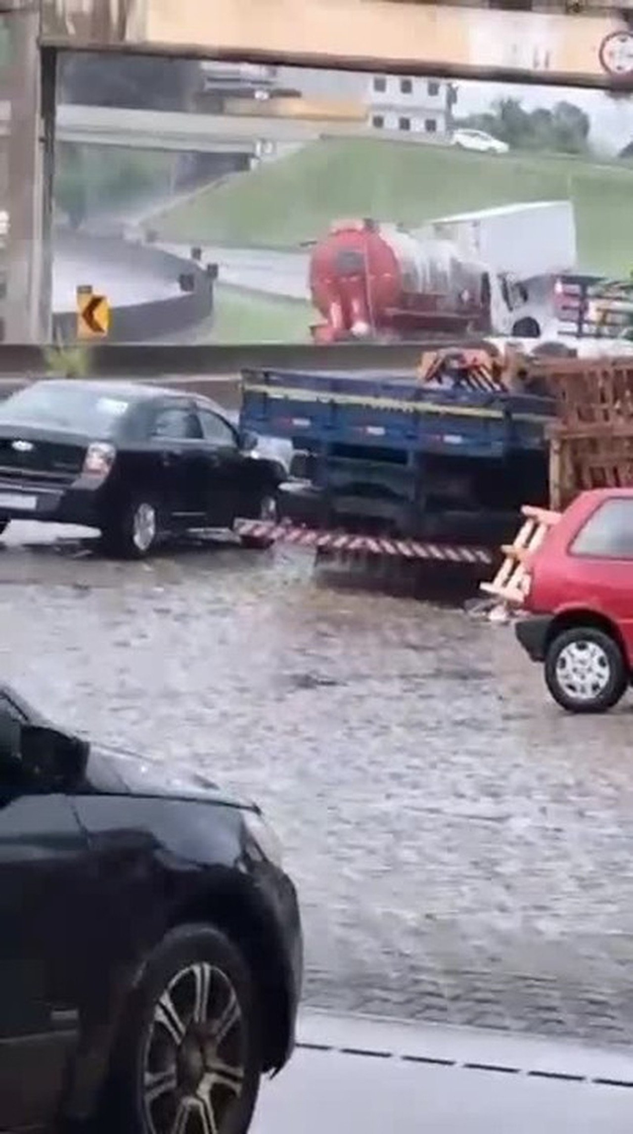 Vídeo: Carreta fica em ‘L’ após passar por poça d’água na Via Dutra, em Barra Mansa