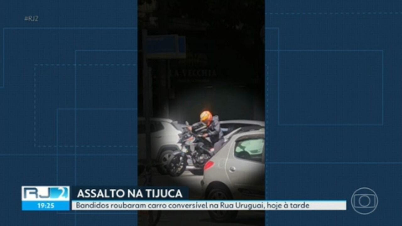 Vídeo mostra bandidos roubando carro de luxo conversível à luz do dia na Tijuca