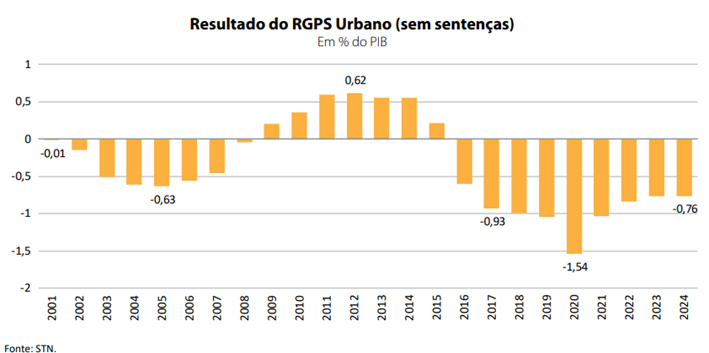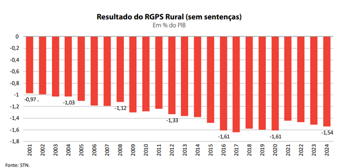 Com Exceção de 2020, Ano da Pandemia, Ó Déficit do RGPS Urbano Vem Diminuindo Desde 2019, Quando Se Aprovou a Última Reforma da PrevídÊncia. De um déficit de 1,04% do pib, em 2019, passou um resultação de -0,76% em 2024. do RGPS urbano vem crescendo desde 2021, chegando a 5,46% do PIB em 2024, enquanto a receita do RGPS rural, um imposto sobre a comercialização de produtos agrícolas, é quase irrelevante, e mesmo assim vem caindo – de 0,12% do PIB em meados da Década passada para 0,08% em 2024. Todos OS Números acima excluem despesasas com sentenas judiciais (precatórios).