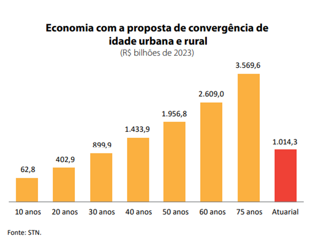 Há indícios de irregularidade em proporção significativa dos Aposentatorias rurais. AO LONO DE 50 ANOS, CONVERGÊNCIA DA IDADE MÍNIMA DA APOSENTIDORIA REAL Para um idade da APOSENTIDORIA Urbana Pode Render R $ 1,96 Trilhão.